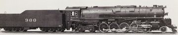 This locomotive, numbered 601, was based on the Burlington class M-4 and was one of the heaviest and most powerful non-articulated locomotives of the time at a service weight of 502,630 pounds without a tender. It had drivers of 64 inches (1,626 mm) and cylinders of 31 by 32 inches. Together with its trailing truck booster, it developed a tractive effort of 115,206 pounds. Its boiler produced up to 4,690 hp.
